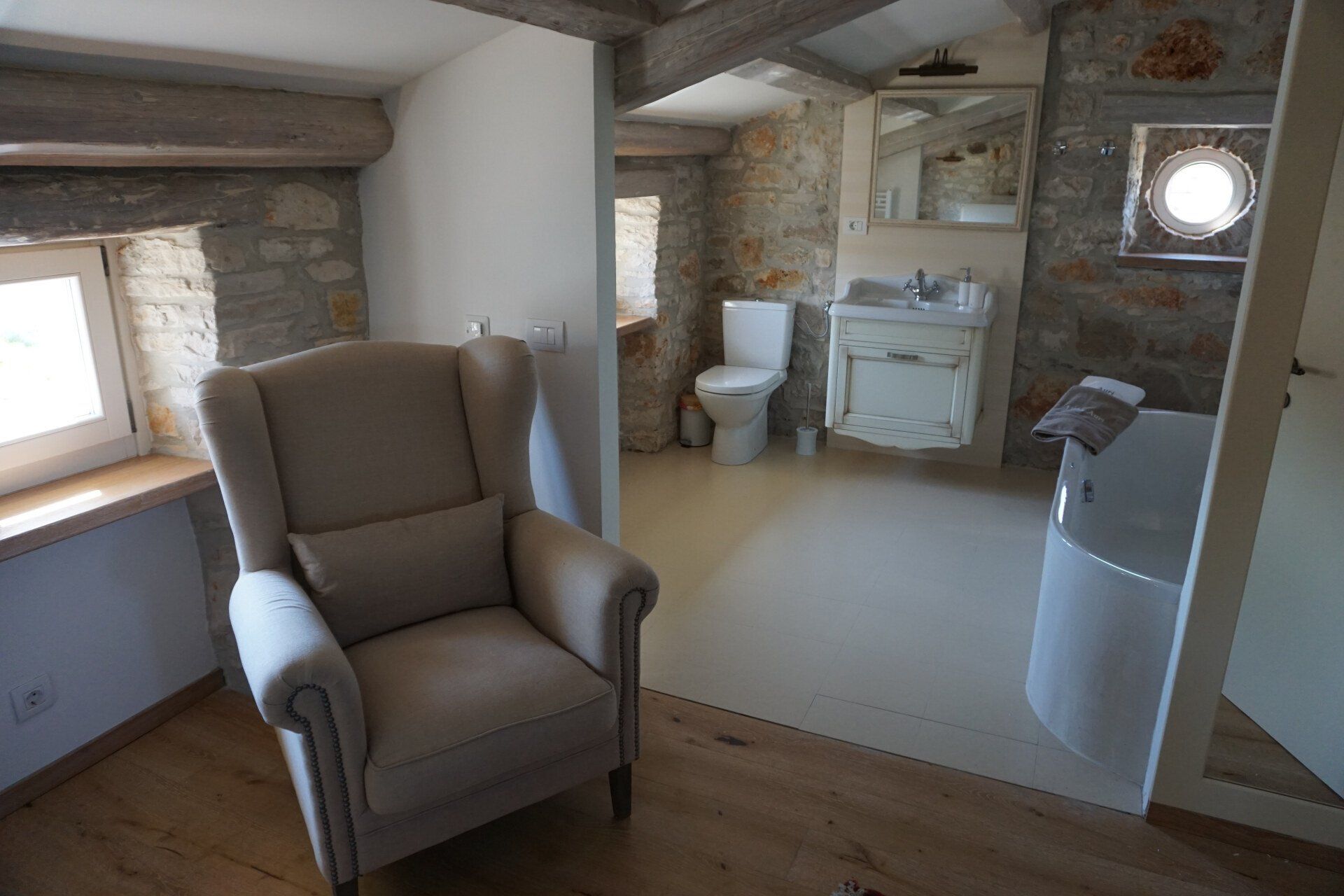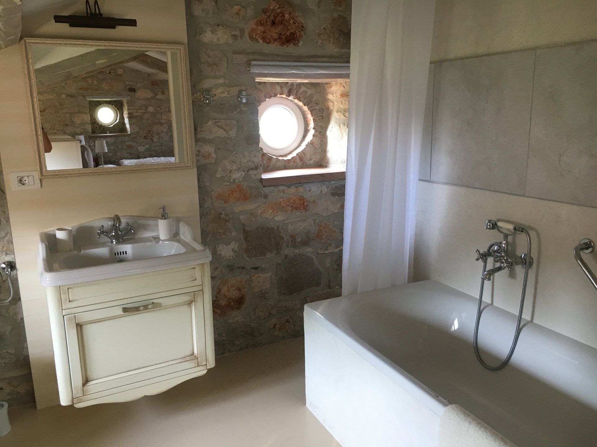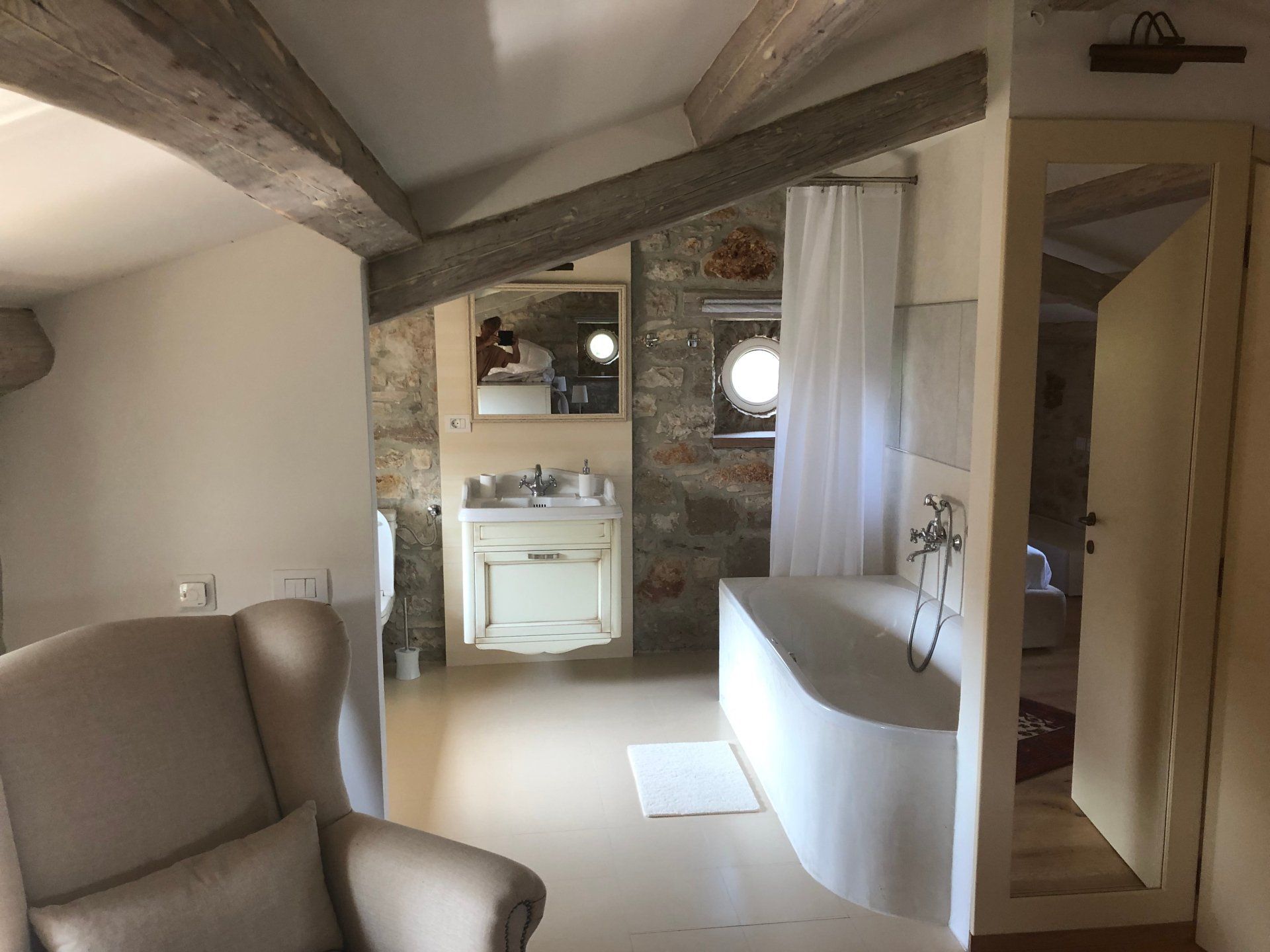 Großzügiges Schlafzimmer mit Doppelbett und Meerblick sowie Bad en Suite mit Badewanne